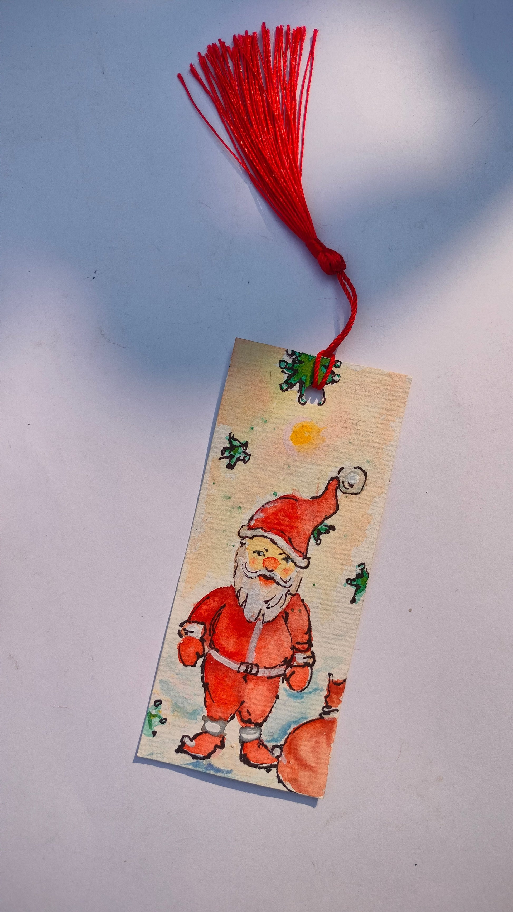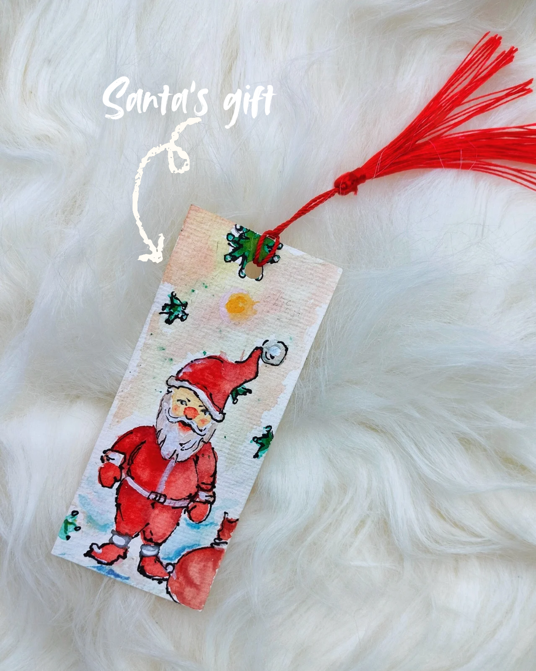 Hand-painted Santa’s Gift bookmark in watercolor. Perfect Christmas gift or stocking stuffer for book lovers. Unique festive design. Shop now.